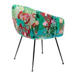 バックレストからアームレストまで一体化した丸みのある可愛らしいフォルム。パウダーコーティングされたブラック色のスチール製の4本の脚は糸の様に細く、足先が丸く可愛らしい。華やかな花柄、可愛らしいフォルムに清楚な印象の脚部が創り出す楽園のような世界観。至福の時を過ごすのにぴったりなダイニングチェアです。