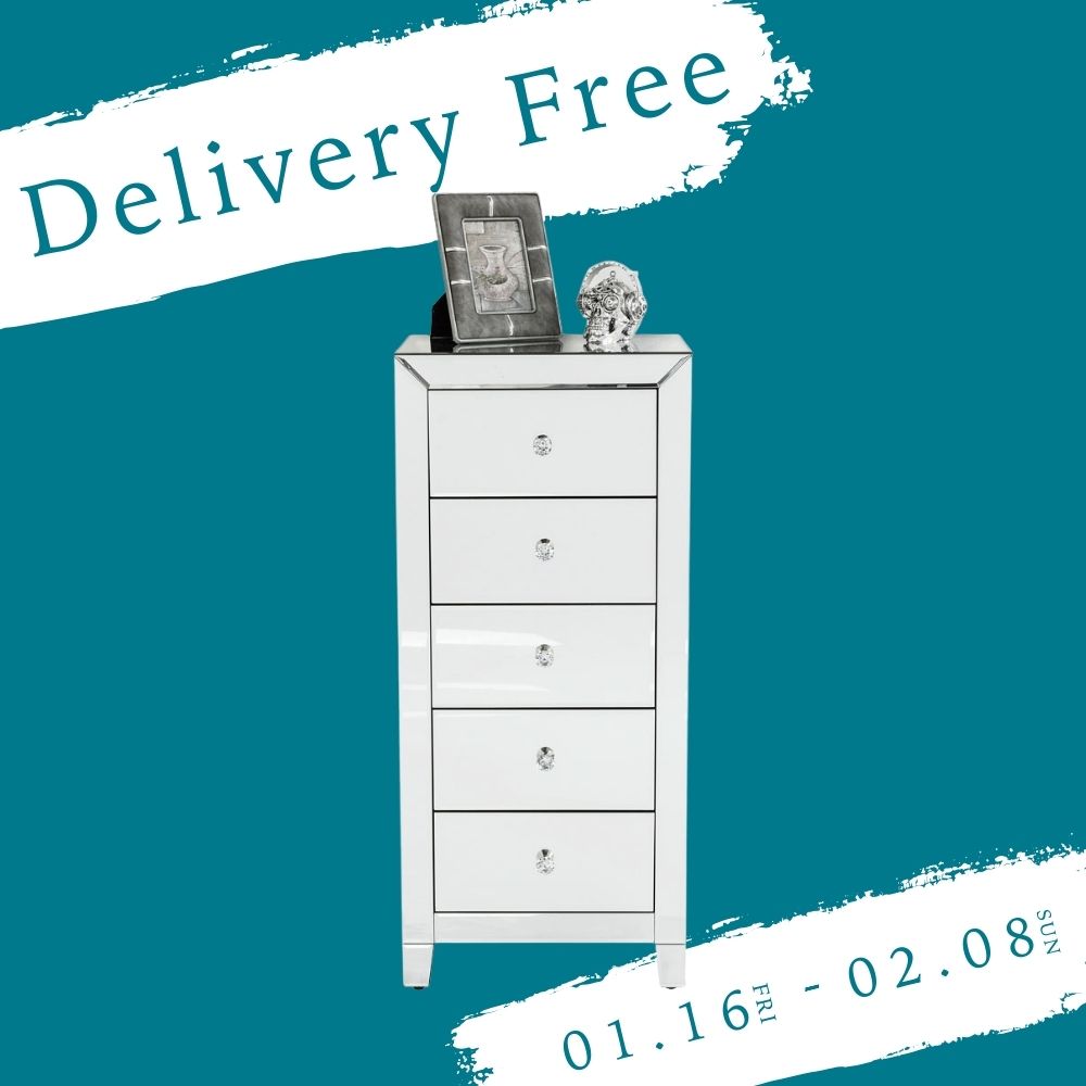 心地よい温かさに包まれる。豪華だけれど派手すぎない、均整の取れたLUXURY(ラグジュアリー)シリーズのキャビネット。ミラーガラス製の表面と、キラキラと光るジュエリーのような取っ手が特徴的なエレガントなキャビネットです。5つの引き出しがある、ミラー張りのハイチェスト。直線的な幾何学模様を特徴とし鏡やメタリックなどモダンな素材を取り入れた、スタイリッシュなアール・デコ様式を思い起こさせるデザインです。好景気に沸いたハリウッドの華やかなイメージが反映されたグラマラスさと、モダンで洗練された魅力を閉じ込めたようなキャビネット。引き出しを開けるたびに、心も体もキラキラと磨きがかかることでしょう。