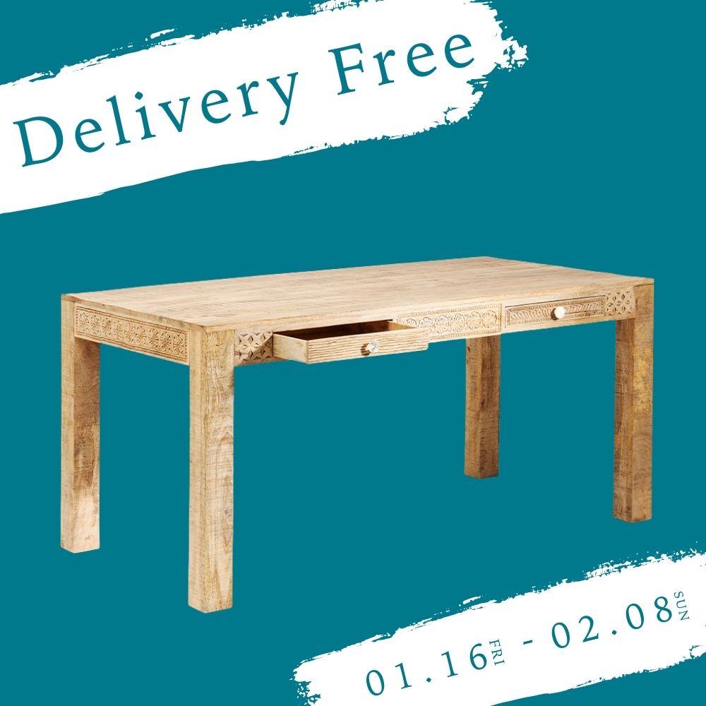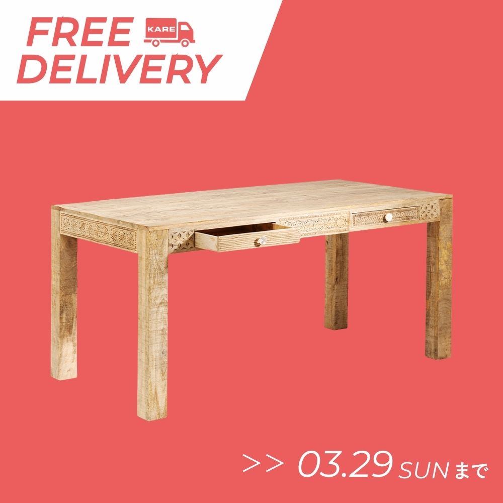 「PURO(プロ)」ダイニングテーブルはマンゴーウッドの天然木を切り落としたままの無塗装な天板に、角材の脚部。余計な装飾のない素朴な味わい。幕板の両サイドに引き出しが2杯。中央には花のモチーフ。