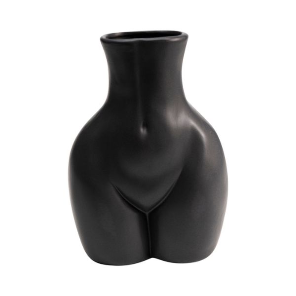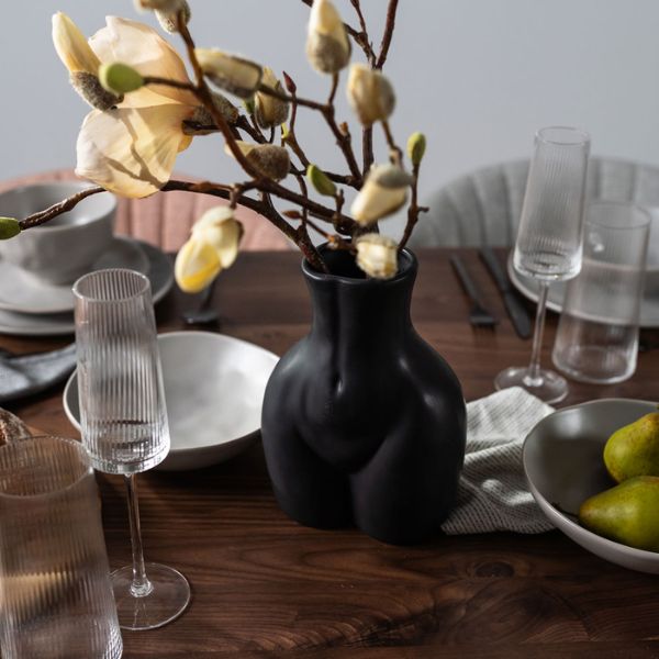 やわらかな曲線が美しく、まるで彫刻のようなフラワーベース。光沢感のあるブラックが空間を引き締め、どんな花の色も引き立ててくれます。モダンで個性的な一品です。