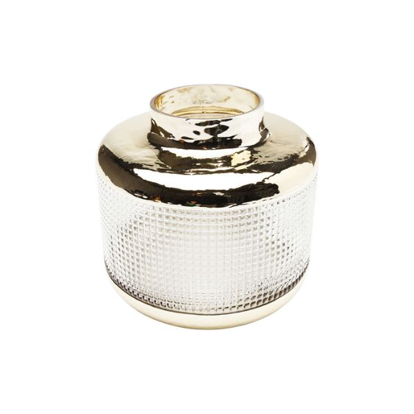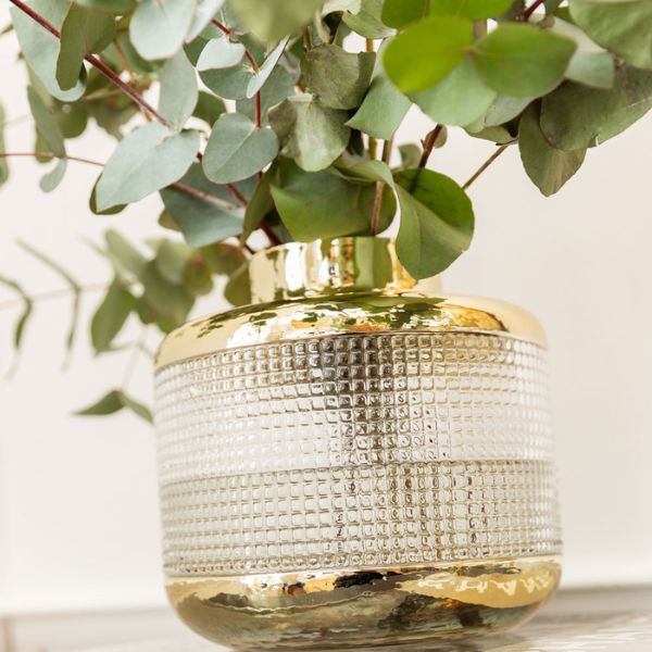 透明感のあるガラスにゴールドのアクセントを効かせた、上品で洗練されたデザイン。エンボス加工の立体感ときらめきが、お花の美しさをより引き立てます。